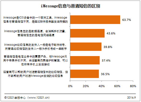 窗口將于5秒鐘后關閉12321舉報中心在2016年上半年手機短信調查報告中,用戶對iMessage信息的認知:排首位的是:“iMessage是iOS設備中的一個聊天工具,iMessage信息與普通短信不同,是通過軟件服務器發送傳播的”(占比63.7%)。其次是“iMessage信息走的是數據通道,會消耗手機流量,普通短信走的是電信網絡通道”(占比43.6%)。“運營商可以幫助用戶過濾普通短信中的垃圾短信,但不能幫助用戶過濾iMessage發送的垃圾信息”(占比36.5%)。“iMessage垃圾信息的發件人一般是電子郵件帳號,而普通垃圾短信的發件人一般為手機號或一串數字”(占比39.8%)。27.9%的用戶知道“iMessage可以對陌生信息進行過濾”,72.1%的用戶不知道該功能的存在。