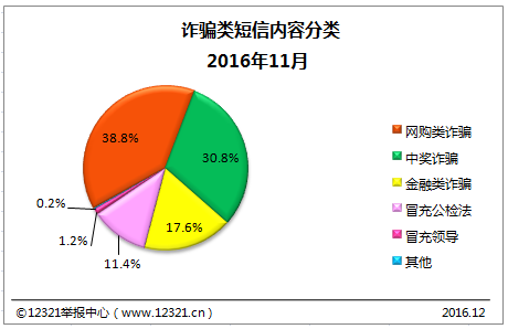 窗口將于5秒鐘后關(guān)閉2016年11月,12321舉報中心共收到舉報短信18548件次中,內(nèi)容涉嫌違法類的共10589件次,占比57.1%。涉嫌詐騙類垃圾短信3625件次,經(jīng)核實并處理了2052件次。通過對詐騙類短信內(nèi)容分析,詐騙類短信被舉報較多的分類為網(wǎng)購類詐騙(38.8%)、中獎詐騙(30.8%)、金融類詐騙(17.6%)。