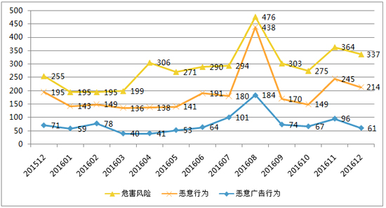 窗口將于5秒鐘后關閉2016年12月,共有337款APP受到了12321舉報中心和應用商店的聯動下架處置。如圖所示,被下架APP數量環比下降7.4%。在337款具有危害風險的APP中,存在網絡安全問題的APP有259款,其中,具有惡意行為的APP有214款,具有惡意廣告行為的APP有61款;存在信息安全問題的APP有92款,其中,具有改號問題的APP有61款,具有色情問題的APP有15款,具有其他問題的APP有16款。(因存在多種不良行為共存情況,故統計數據量有重合)