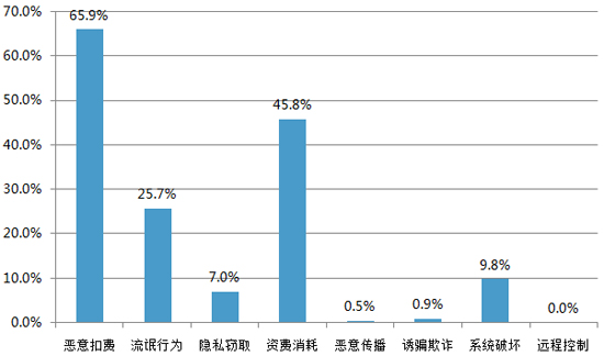 從被下架APP的惡意行為來看:如圖所示,12月份存在惡意行為的214款被下架APP中,65.9%的APP存在“惡意扣費”情況,25.7%的APP存在“流氓行為”,7.0%的APP存在“隱私竊取”情況,45.8%的APP存在“資費消耗”情況,0.5%的APP存在“惡意傳播”情況,0.9%的APP存在“系統破壞”情況。
