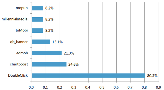 從被下架APP的廣告平臺植入情況來看:12月份,有61款被下架APP植入了廣告平臺,共植入廣告平臺154個,因為植入廣告平臺下架的APP中,平均每款植入的廣告平臺為3.67個,最多的一款APP植入了17個不同的廣告平臺;有植入廣告平臺的APP中,植入比例較高廣告平臺如圖所示。