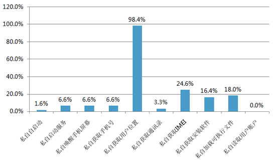 從被下架APP的惡意廣告行為來看:12月份,61款因為植入了廣告平臺下架的APP,不同程度的存在惡意廣告行為。如圖所示,在植入廣告平臺的APP中,1.6%的APP存在“私自自啟動”的情況,6.6%的APP存在“私自啟動服務”的情況,6.6%的APP存在“私自喚醒手機屏幕”的情況,6.6%的APP存在“私自獲取手機號”的情況,98.4%的APP存在“私自獲取用戶位置”的情況,3.3%的APP存在“私自獲取通訊錄”的情況,24.6%的APP存在“私自獲取IMEI”的情況,16.4%的APP存在“私自獲取安裝軟件”的情況,18.0%的APP存在“私自加載可執行文件”的情況。