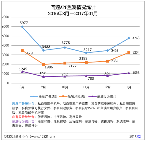 1月,12321舉報中心聯合百家應用商店下架處置不良APP 319款,較上月下降5.3%。