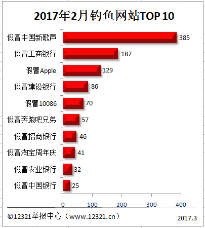 被舉報最多的是假冒“中國新歌聲”的釣魚詐騙網站,舉報量達385件次,比1月份增加了9.6%。排名第二的是假冒“工商銀行”,比1月份減少了60.5%。