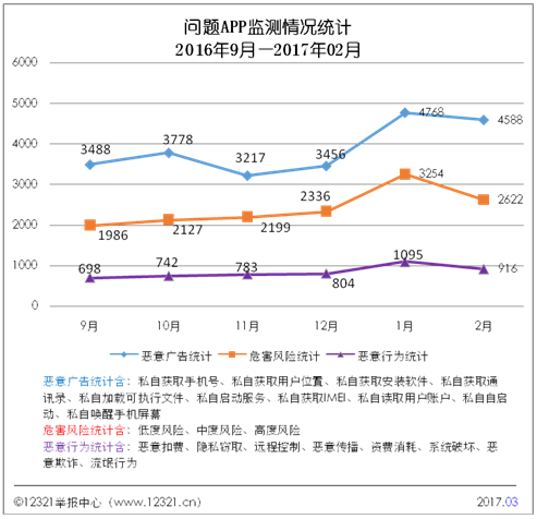 2月,12321舉報(bào)中心聯(lián)合百家應(yīng)用商店下架處置惡意APP 223款,較上月下降30.1%。