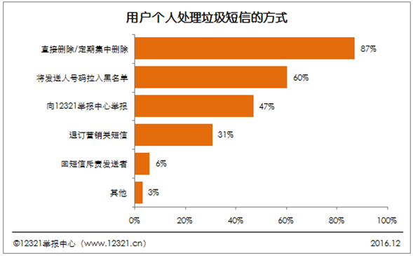 窗口將于5秒鐘后關閉12321舉報中心在2016年下半年的手機短信調查中顯示,“直接刪除/定期集中刪除”是用戶處理垃圾短信的主要方式。其次是“將發送人號碼拉入黑名單”和“向12321舉報中心舉報”。“回短信斥責發送者”這種方式更是不可取的,不僅不能減少垃圾短信,還有可能帶來更多麻煩。較多的用戶會選擇“退訂營銷類短信”的方式,該種方法在規范營銷的情況能夠起到減少垃圾短信的效果,但如果出現退訂后依然存在收到同類短信的情況,可向12321舉報中心舉報。12321在此建議用戶積極舉報,刪除和拉黑的這兩種處理措施都不能起到治理垃圾短信的效果。通過正確的方法和渠道去維護自身的合法權益。