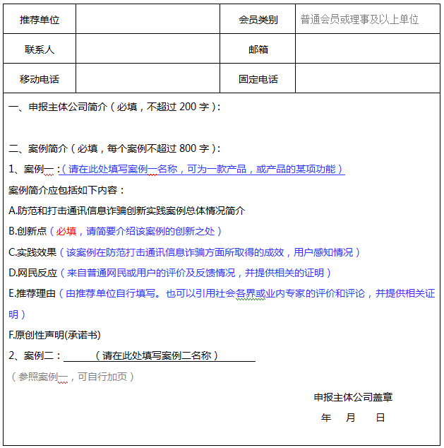 (一)填寫《防范打擊通訊信息詐騙創(chuàng)新實踐案例推薦表》(表格模版及填寫說明見附件);