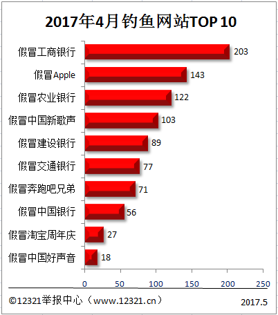 被舉報最多的是假冒“工商銀行”的釣魚詐騙網站,舉報量達203件次,比3月份增加了41.4%。排名第二的是假冒“Apple”,比3月份增加了4.9%。