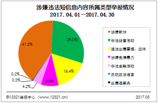 4月份,12321舉報中心共收到舉報短信1.3萬件次(包含12321舉報助手、搜狗號碼通、360手機助手、百度衛士、公信衛士、支付寶/微信/手機QQ的城市服務等渠道舉報),舉報內容為垃圾類的1.0萬件次,占比76%。內容涉嫌違法類的共0.3萬件次,占比24%。其中,內容涉嫌違法類被舉報較多的分類為涉嫌欺詐類(41.2%)、非法經營活動(29.0%)、違法出售票據、證件(16.4%)。