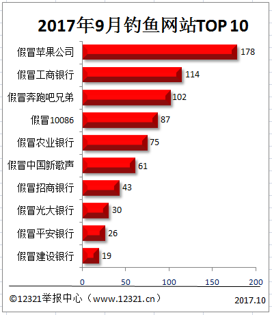 被舉報最多的是假冒蘋果公司的釣魚詐騙網(wǎng)站,舉報量達(dá)178件次,比8月份減少了7.3%。排名第二的是假冒工商銀行的釣魚詐騙網(wǎng)站,比8月份增加了10.5%。