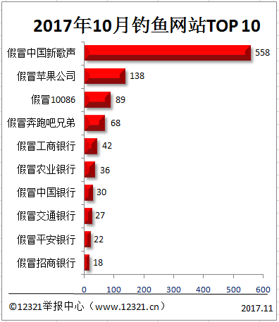 被舉報(bào)最多的是假冒中國新歌聲的釣魚詐騙網(wǎng)站,舉報(bào)量達(dá)558件次,比9月份增加了914.8%。排名第二的是假冒蘋果公司的釣魚詐騙網(wǎng)站,比9月份減少了22.4%。