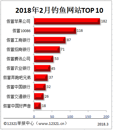 被舉報(bào)最多的是假冒蘋果公司的釣魚詐騙網(wǎng)站,舉報(bào)量達(dá)182件次,比1月份增加了2.2%。排名第二的是假冒10086的釣魚詐騙網(wǎng)站,比1月份減少了8.6%。
