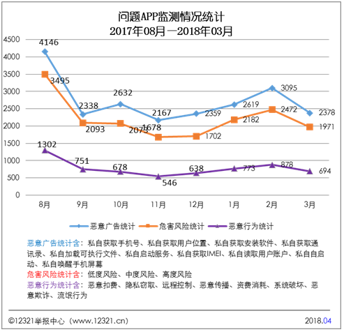 3月,12321舉報中心聯合百家應用商店下架處置惡意APP 136款。