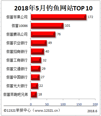 被舉報(bào)最多的是假冒蘋果公司的釣魚詐騙網(wǎng)站,舉報(bào)量達(dá)172件次,比4月份減少了4.9%。排名第二的是假冒10086的釣魚詐騙網(wǎng)站,比4月份減少了23.5%。
