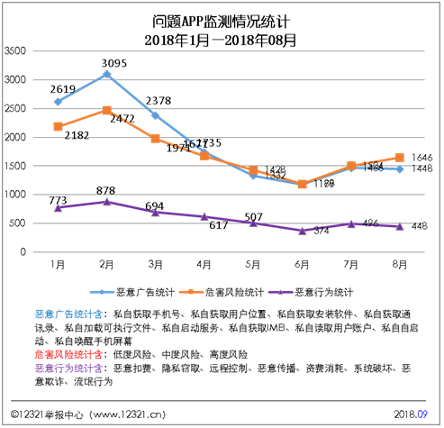 2018年8月,12321舉報中心聯合百家應用商店下架處置惡意APP 119款。