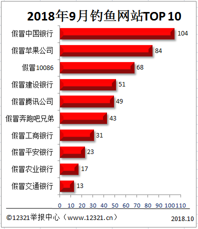 被舉報最多的是假冒中國銀行的釣魚詐騙網(wǎng)站,舉報量達(dá)104件次,比8月份增加了51.9%。排名第二的是假冒蘋果公司的釣魚詐騙網(wǎng)站,比8月份減少了22.9%。