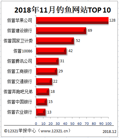 被舉報最多的是假冒蘋果公司的釣魚詐騙網(wǎng)站,舉報量達128件次,比10月份增加了23.4%。排名第二的是假冒建設(shè)銀行的釣魚詐騙網(wǎng)站,比10月份增加了11.6%。