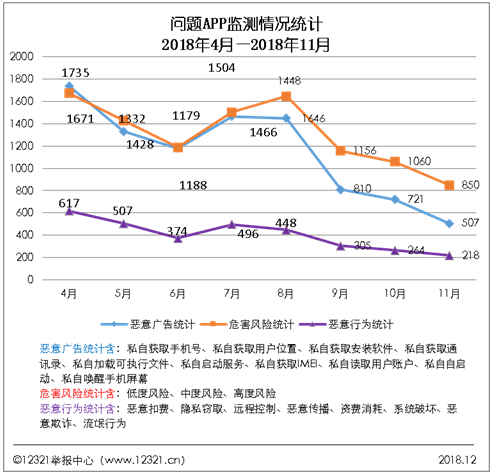 2018年10至11月,12321舉報中心聯合百家應用商店下架處置惡意APP 96款。