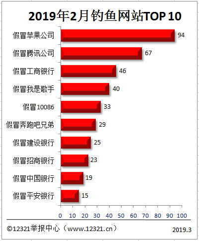 被舉報最多的是假冒蘋果公司的釣魚詐騙網站,舉報量達94件次,比1月份減少了12.9%。排名第二的是假冒騰訊公司的釣魚詐騙網站,比1月份增加了7.5%。