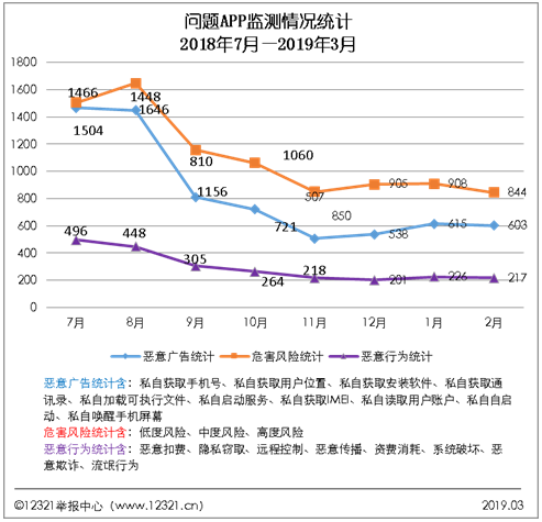 2019年02月,12321舉報中心聯合百家應用商店下架處置惡意APP 77個。