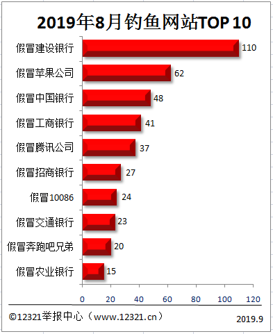 被舉報最多的是假冒建設銀行的釣魚詐騙網站,舉報量達110件次,比7月份減少了6.8%。排名第二的是假冒蘋果公司的釣魚詐騙網站,比7月份減少了10.1%。