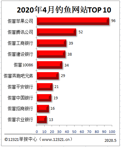 被舉報最多的是假冒蘋果公司的釣魚詐騙網站,舉報量達96件次,比3月份增加了7.3%。排名第二的是假冒騰訊公司的釣魚詐騙網站,比3月份減少了2.1%。