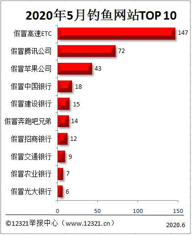 被舉報最多的是假冒高速ETC的釣魚詐騙網(wǎng)站,舉報量達147件次。近期,假冒高速ETC的釣魚詐騙網(wǎng)站增多,提醒廣大車主收到此類短信務必提高警惕,切勿點擊來路不明短信中的網(wǎng)頁鏈接,也不要隨意將銀行卡信息和密碼對外透露,有任何疑問及時向辦理ETC的相關部門進行咨詢核實。排名第二的是假冒騰訊公司的釣魚詐騙網(wǎng)站,比4月份增加了27.8%。