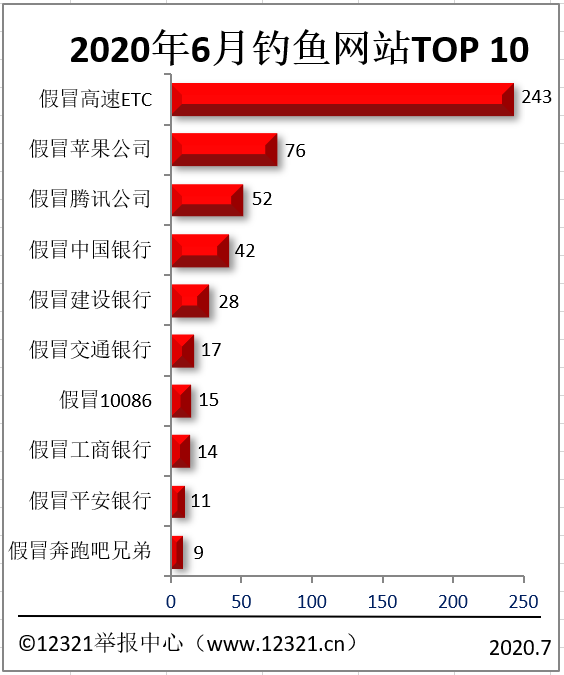 根據12321網絡不良與垃圾信息舉報受理中心(www.hzsyr.com)接到網民舉報的短信、郵件、網站等信息,2020年6月,被舉報的釣魚網站前十名如下:
