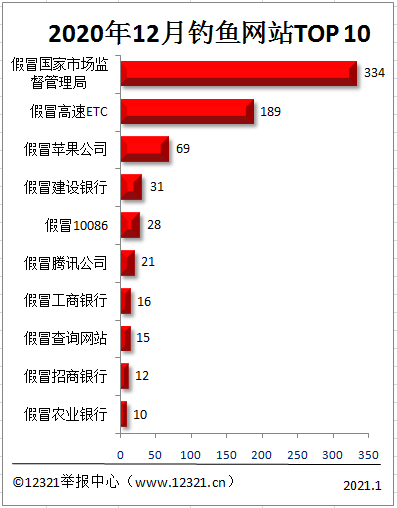 被舉報最多的是假冒國家市場監(jiān)督管理局的釣魚詐騙網站,舉報量達334件次。比11月份增加了36.3%。排名第二的是假冒高速ETC的釣魚詐騙網站,比11月份減少了10.1%。