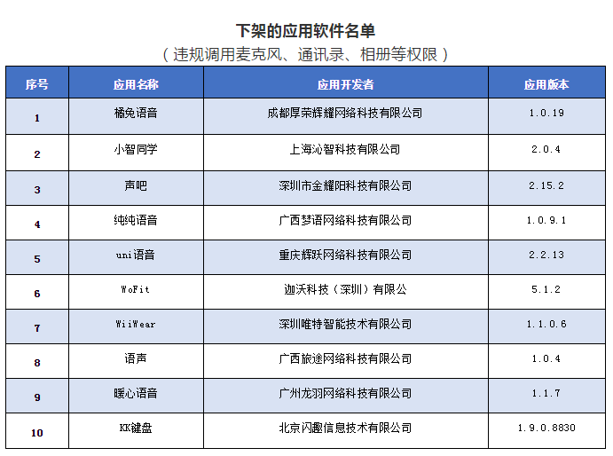 依據《網絡安全法》和《移動智能終端應用軟件預置和分發管理暫行規定》(工信部信管〔2016〕407號)等法律和規范性文件要求,我部組織對上述10款APP進行下架。相關應用商店應在本通報發布后,立即組織對名單中應用軟件進行下架處理。