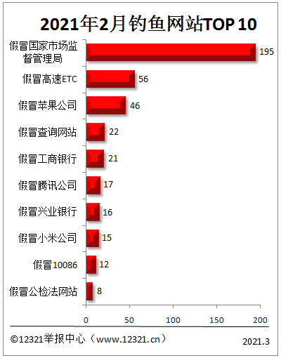 被舉報最多的是假冒國家市場監督管理局的釣魚詐騙網站,舉報量達195件次。比1月份減少了59.6%。排名第二的是假冒高速ETC的釣魚詐騙網站,比1月份減少了9.7%。