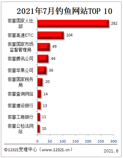被投訴最多的是假冒國家人社部的釣魚詐騙網站,投訴量達282件次。近期,投訴假冒國家人社部的釣魚詐騙網站增多。12321提醒:人社部門發送的社??ㄞk卡(電子社保卡申領)短信,不會附加任何網址、鏈接,推送的短信不需要輸入任何涉及個人信息、金融賬號等私密信息。不要隨便點擊不明鏈接,更不能透露自己的個人身份信息、賬戶信息及密碼等個人信息。投訴排名第二的是假冒高速ETC的釣魚詐騙網站,比6月份減少了60.3%。