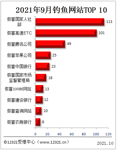 被投訴最多的是假冒國家人社部的釣魚詐騙網站,投訴量達113件次,比8月份減少了61.1%。投訴排名第二的是假冒高速ETC的釣魚詐騙網站,比8月份減少了10.6%。