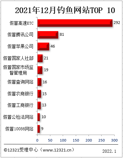 根據12321網絡不良與垃圾信息舉報受理中心(www.hzsyr.com)接到網民投訴的短信、郵件、網站等信息,2021年12月,被投訴的釣魚網站前十名如下:
