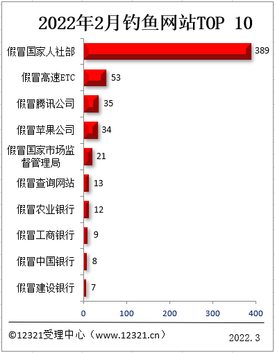 被投訴最多的是假冒國家人社部的釣魚詐騙網站,投訴量達389件次,比1月份增加了380.2%。投訴排名第二的是假冒高速ETC的釣魚詐騙網站,比1月份減少了362.3%。