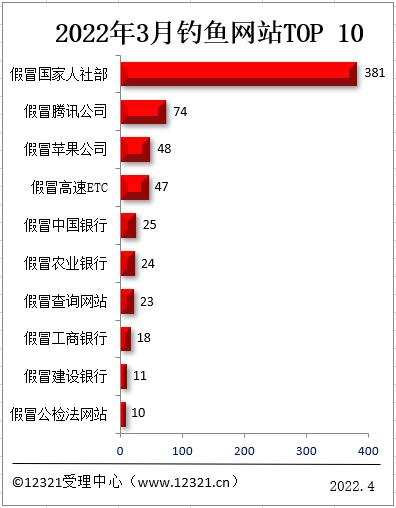 被投訴最多的是假冒國家人社部的釣魚詐騙網(wǎng)站,投訴量達(dá)381件次,比2月份減少了2.1%。投訴排名第二的是假冒騰訊公司的釣魚詐騙網(wǎng)站,比2月份增加了111.4%。