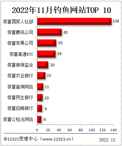 被投訴最多的是假冒國家人社部的釣魚詐騙網站,投訴量達136件次,比10月份增加了21.4%。投訴排名第二的是假冒騰訊公司的釣魚詐騙網站,比10月份增加了40.6%。