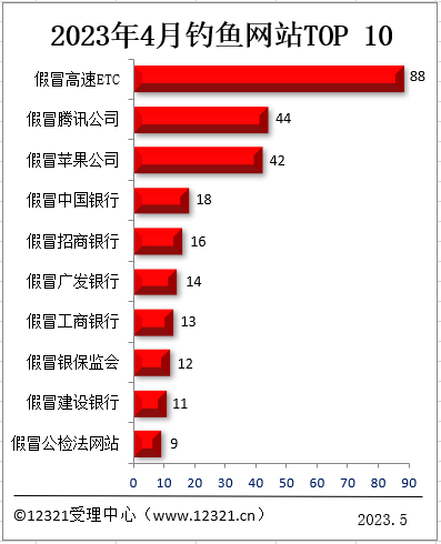 根據(jù)12321網(wǎng)絡(luò)不良與垃圾信息舉報(bào)受理中心(www.hzsyr.com)接到網(wǎng)民投訴的短信、郵件、網(wǎng)站等信息,2023年4月,被投訴的釣魚(yú)網(wǎng)站前十名如下: