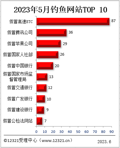根據12321網絡不良與垃圾信息舉報受理中心(www.hzsyr.com)接到網民投訴的短信、郵件、網站等信息,2023年5月,被投訴的釣魚網站前十名如下: