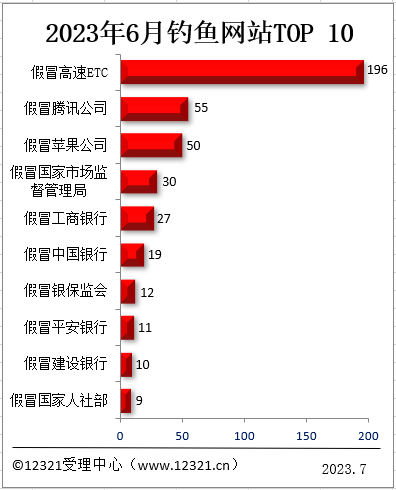根據12321網絡不良與垃圾信息舉報受理中心(www.hzsyr.com)接到網民投訴的短信、郵件、網站等信息,2023年6月,被投訴的釣魚網站前十名如下: