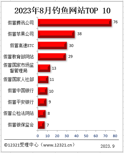 根據12321網絡不良與垃圾信息舉報受理中心(www.hzsyr.com)接到網民投訴的短信、郵件、網站等信息,2023年8月,被投訴的釣魚網站前十名如下: