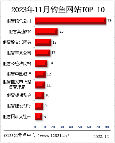被投訴最多的是假冒騰訊公司的釣魚詐騙網站,投訴量達79件次,比10月份增加了1.3%。投訴排名第二的是假冒高速ETC的釣魚詐騙網站,比10月份增加了25.1%。