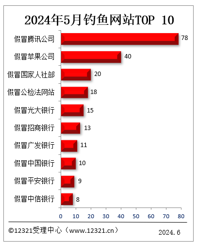 根據12321網絡不良與垃圾信息舉報受理中心(www.hzsyr.com)接到網民投訴的短信、郵件、網站等信息,2024年5月,被投訴的釣魚網站前十名如下: