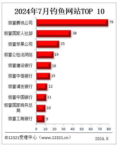 根據12321網絡不良與垃圾信息舉報受理中心(www.hzsyr.com)接到網民投訴的短信、郵件、網站等信息,2024年7月,被投訴的釣魚網站前十名如下: