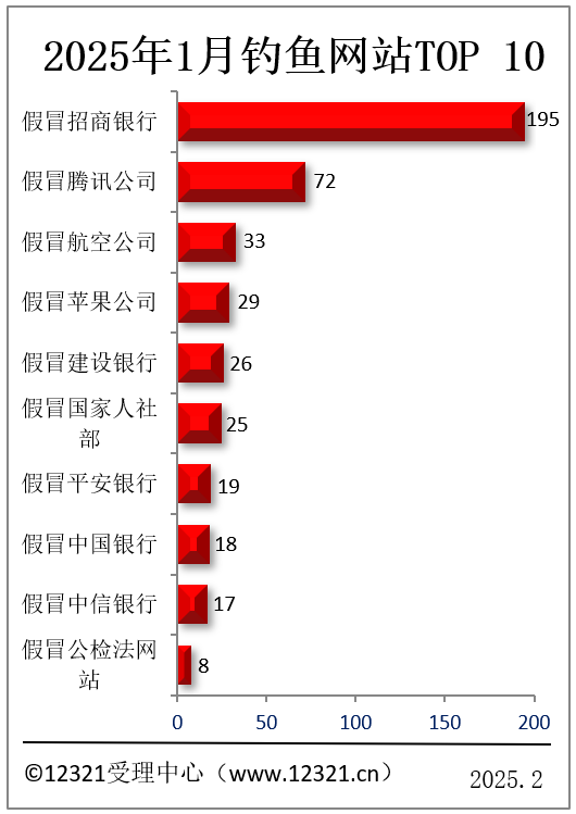 根據(jù)12321網(wǎng)絡(luò)不良與垃圾信息舉報(bào)受理中心(www.hzsyr.com)接到網(wǎng)民投訴的短信、郵件、網(wǎng)站等信息,2025年1月,被投訴的釣魚網(wǎng)站前十名如下: