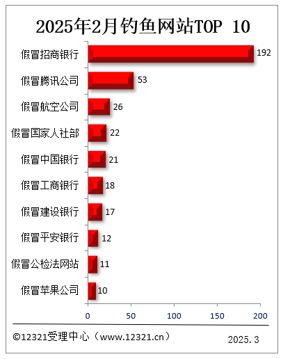 根據12321網絡不良與垃圾信息舉報受理中心(www.hzsyr.com)接到網民投訴的短信、郵件、網站等信息,2025年2月,被投訴的釣魚網站前十名如下: