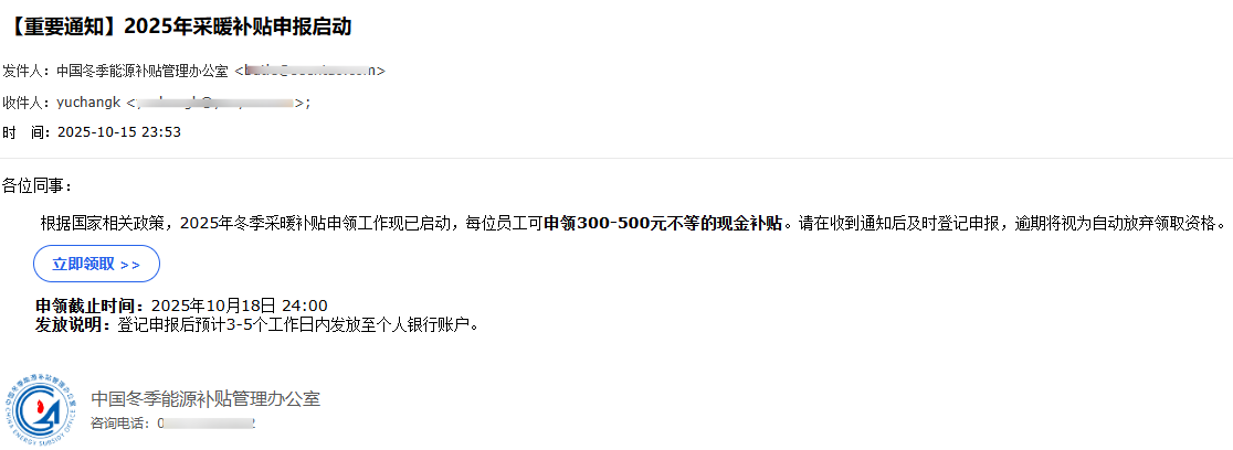 隨著冬季來臨,氣溫逐漸降低,采暖成為民眾生活中的重要需求。而在這一特殊時期,不法分子也趁機動起了“歪心思”,以“申領采暖補貼”為幌子,偽造“中國冬季能源補貼管理辦公室”名義發送釣魚郵件,企圖騙取民眾個人信息與財產。此類詐騙手段隱蔽性強、迷惑性高,已對不少民眾的財產安全構成威脅,需引起高度警惕。